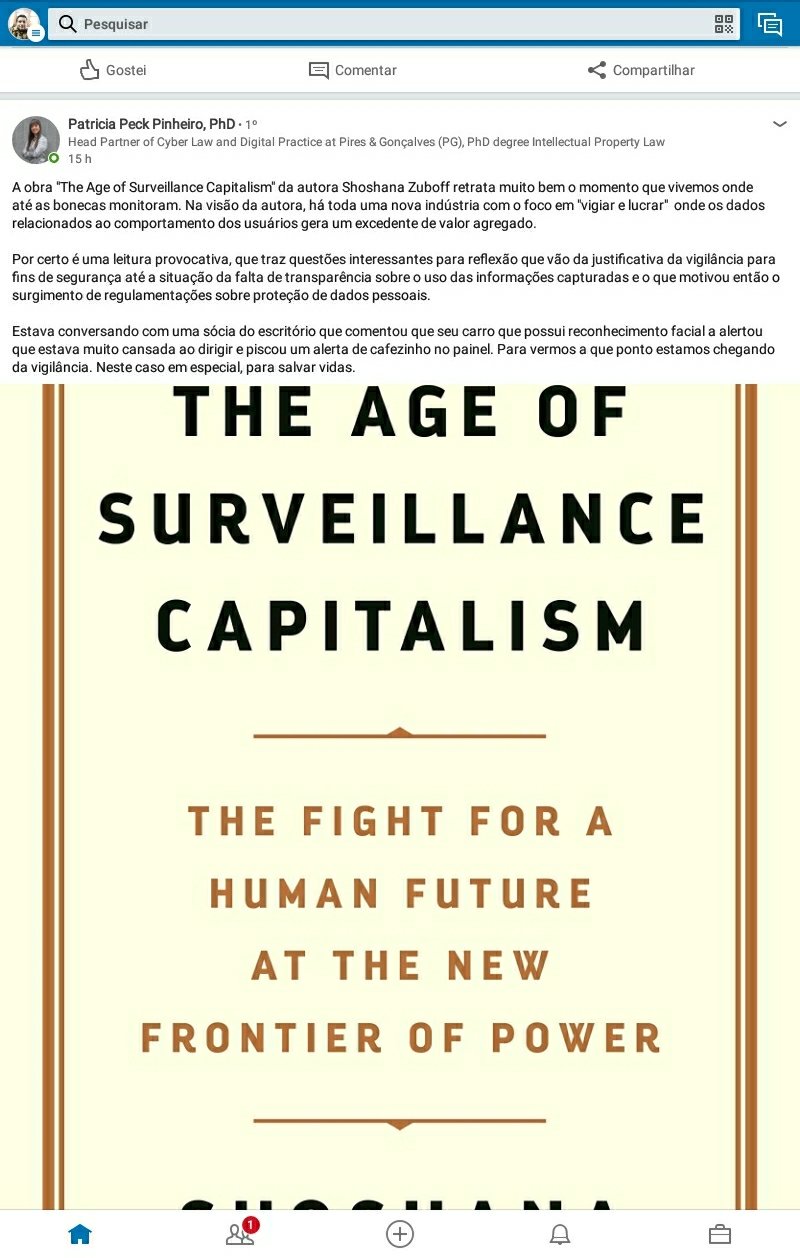 Em seu perfil no linkedin, a advogada Patricia Peck Pinheiro postou comentário sobre o livro “The Age of Surveillance Capitalism”, de autoria de Shoshana Zubboff. É assustador.