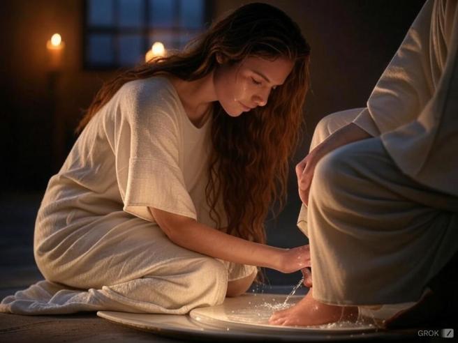 Devemos ser como a prostituta aos pés de Jesus, a lavar-Lhe os pés com o que de mais precioso temos e secá-los com os próprios cabelos – sem nenhuma preocupação com os outros. Mas isso só é possível aos pés de Jesus.