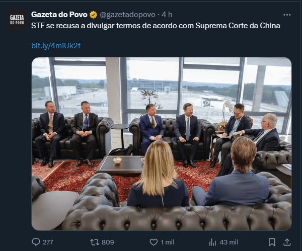 A reportagem da Gazeta do Povo revela que o STF assinou acordos com a Suprema Corte da China, incluindo encontros em 2024 e 2025, focados no uso de IA para otimizar processos. No entanto, o tribunal se recusa a divulgar os termos, citando questões de segurança nacional e relações diplomáticas. Essa opacidade, somada à visita de Luís Roberto Barroso à China em 2024 e à declaração elogiosa de Gilmar Mendes ao regime chinês, levanta suspeitas sobre até que ponto o Brasil poderia estar considerando o modelo chinês.