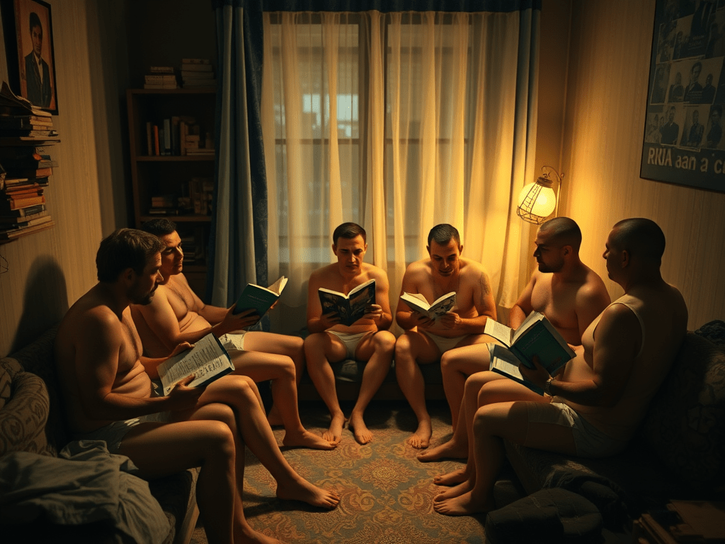 Seis homens, dispostos em círculo, vestiam roupas íntimas femininas e ouviam discursos de figuras como Dilma Rousseff, Kamala Harris, Angela Davis e Judith Butler. Em suas mãos, seguravam livros como Mística e Espiritualidade, de Leonardo Boff, Obra do Artista: Uma Visão Holística do Universo, de Frei Betto, e Teologia Ecofeminista, de Ivone Gebara. A cena, descrita como inusitada, gerou perplexidade entre os presentes.