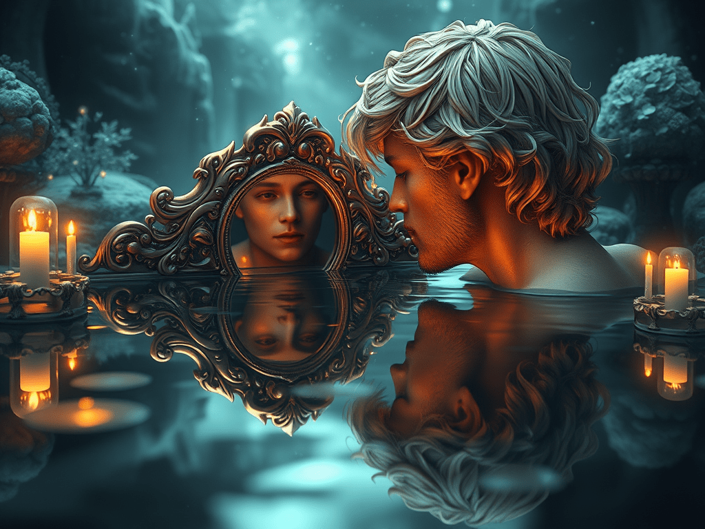 Em outro texto, Cristo e Narciso, utilizo um trecho de O Senhor dos Anéis para comparar Cristo e o narcisismo. Após a aparente morte de Gandalf nas Minas de Moria, Gimli, abalado, contempla o Lago do Espelho, mas vê apenas as estrelas e montanhas, não seu reflexo. Esse episódio simboliza a cura do narcisismo por meio do sacrifício de Cristo, que, assim como no monte Moria bíblico — associado ao sacrifício de Isaque —, redireciona o olhar do indivíduo para a criação divina, em vez de si mesmo. A mina, como símbolo de transformação, reflete o sacrifício de Gandalf, um arquétipo de Cristo, que conduz seus companheiros a uma nova perspectiva espiritual, semelhante ao batismo.